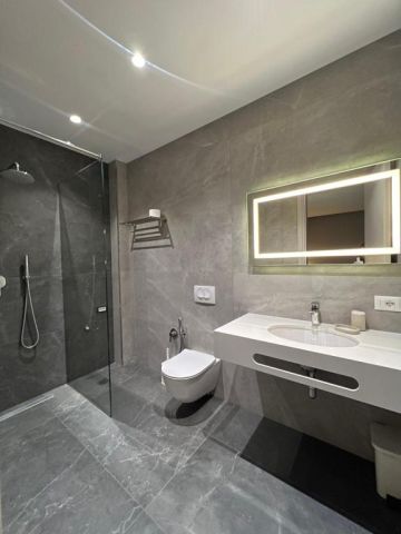 В стаите тип де лукс в банята пространството при душа е отделено с отвесна стъклена преграда.