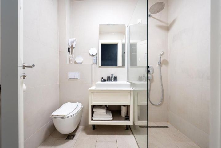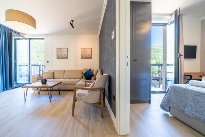 Junior suite с площ от 47 м2, разпределени в две отделени с врата и преходни помещения от дневна и спалня с възможност за настаняване на 3-ма възрастни или семейство с 2 деца; -Апартаменти с площ 72 м2 с две отделни спални помещения и дневна с възможност за настаняване до 4 или 5 възрастни.